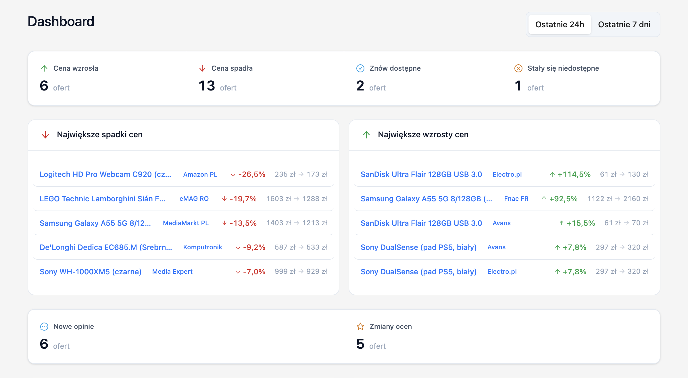 ShopRadar pomaga monitorować dostępność produktów w wielu sklepach, zbierając najważniejsze dane w jednym miejscu. Zamiast ręcznie sprawdzać każdą ofertę, zespół korzysta z dashboardu, który pokazuje kluczowe zmiany w wybranym okresie, w tym oferty, które ponownie pojawiły się w sprzedaży, oraz te, które właśnie stały się niedostępne. Dzięki temu łatwiej szybko wychwycić problem i ustalić, które kanały sprzedaży wymagają natychmiastowej reakcji.