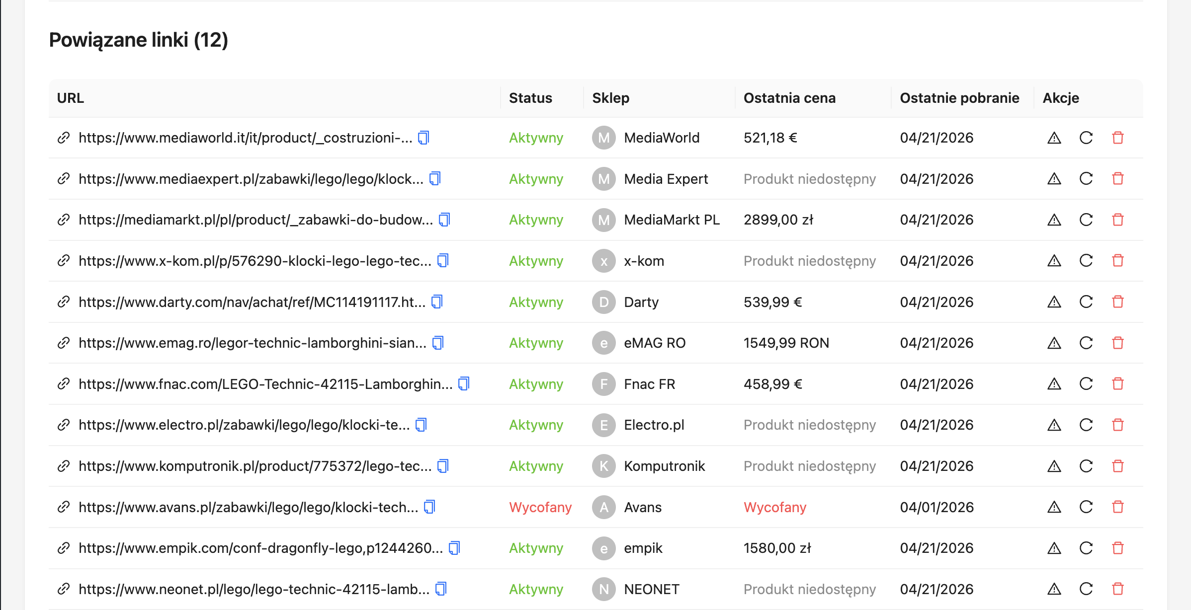Dużą wartość daje również widok szczegółów produktu. Dla jednego SKU można sprawdzić powiązane linki do ofert w różnych sklepach, ich status, ostatnią cenę oraz moment ostatniego pobrania danych. Taki widok porządkuje pracę operacyjną, bo od razu pokazuje, gdzie produkt jest aktywny, gdzie zniknął z oferty i które listingi warto sprawdzić w pierwszej kolejności. Nie trzeba zestawiać danych z wielu źródeł ani odtwarzać sytuacji po fakcie.
